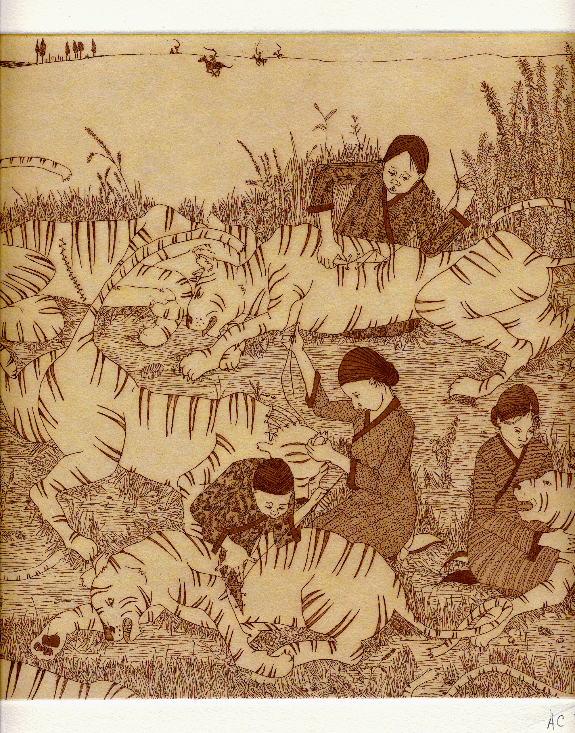 Birding: The image is based on a miniature Indian painting from 1590 that the Artist saw in a book. The painting depicts a great battle in the jungle between a prince's army and the tigers. The Artist picks up at the end of this battle and depicts a group of women mending the tiger's wounds with needle and thread while the prince and his men gallop off into the distance.