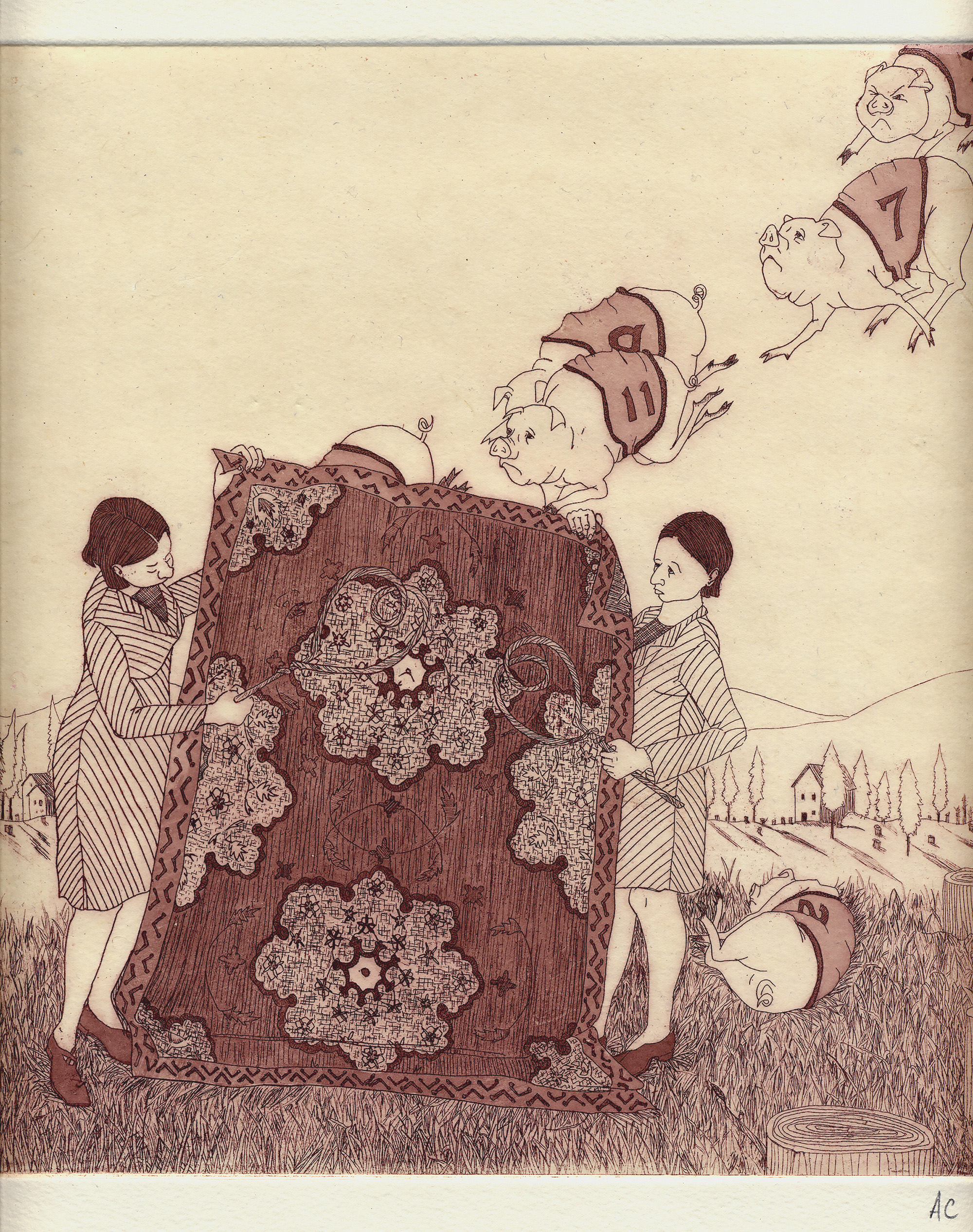 Rug Beater: The women in the image are engaged in the monotonous chore of beating a rug, while the flying pigs are competing in a race. The race comes to an abrupt finish for the pigs when they collide with the women's rug paddles. The image is meant as a possible still taken from a larger story where the viewer is not aware of what happened before or what will happen after this peculiar scene.