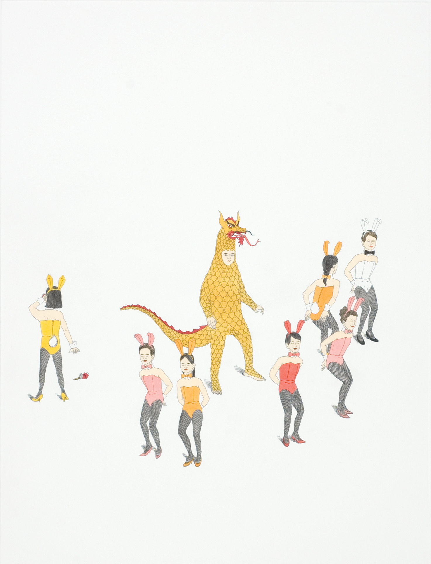 The vibrantly hand-colored costumes and props in del Rosario’s three etchings made at LESP serve as cultural signifiers distinguishing the Old World from the New, the East from the West. In Reformations (2006), for example, he juxtaposes a figure in an Asia-inspired dragon costume with a group of young women dressed as Playboy bunnies. In Counter-Reformations (2006), he juxtaposes an actual dragon — a powerful symbol in Asian cultures — with school-age girls in J-Crew sweaters and skirts. And in Inquisitions (2006), a group of young men, whom del Rosario calls New Traditionalists, wear pinstripe suits and march blindly behind their leader, who carries a sword. The formal suits represent a link to the West, while the sword recalls older, Eastern traditions. These costumes and props are integral to del Rosario’s ever-evolving narrative, uniting all his work, regardless of medium.