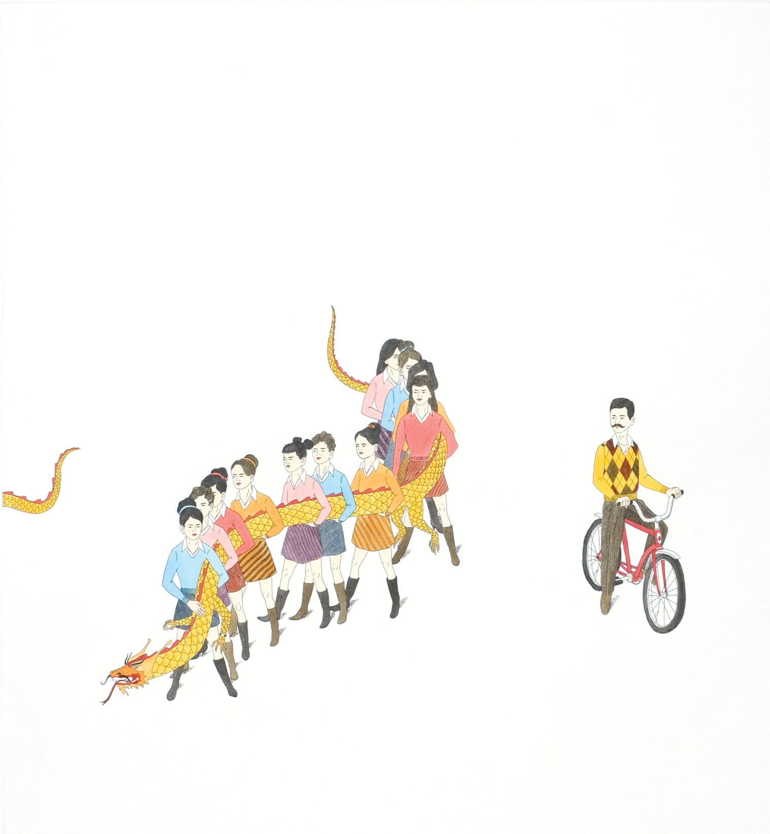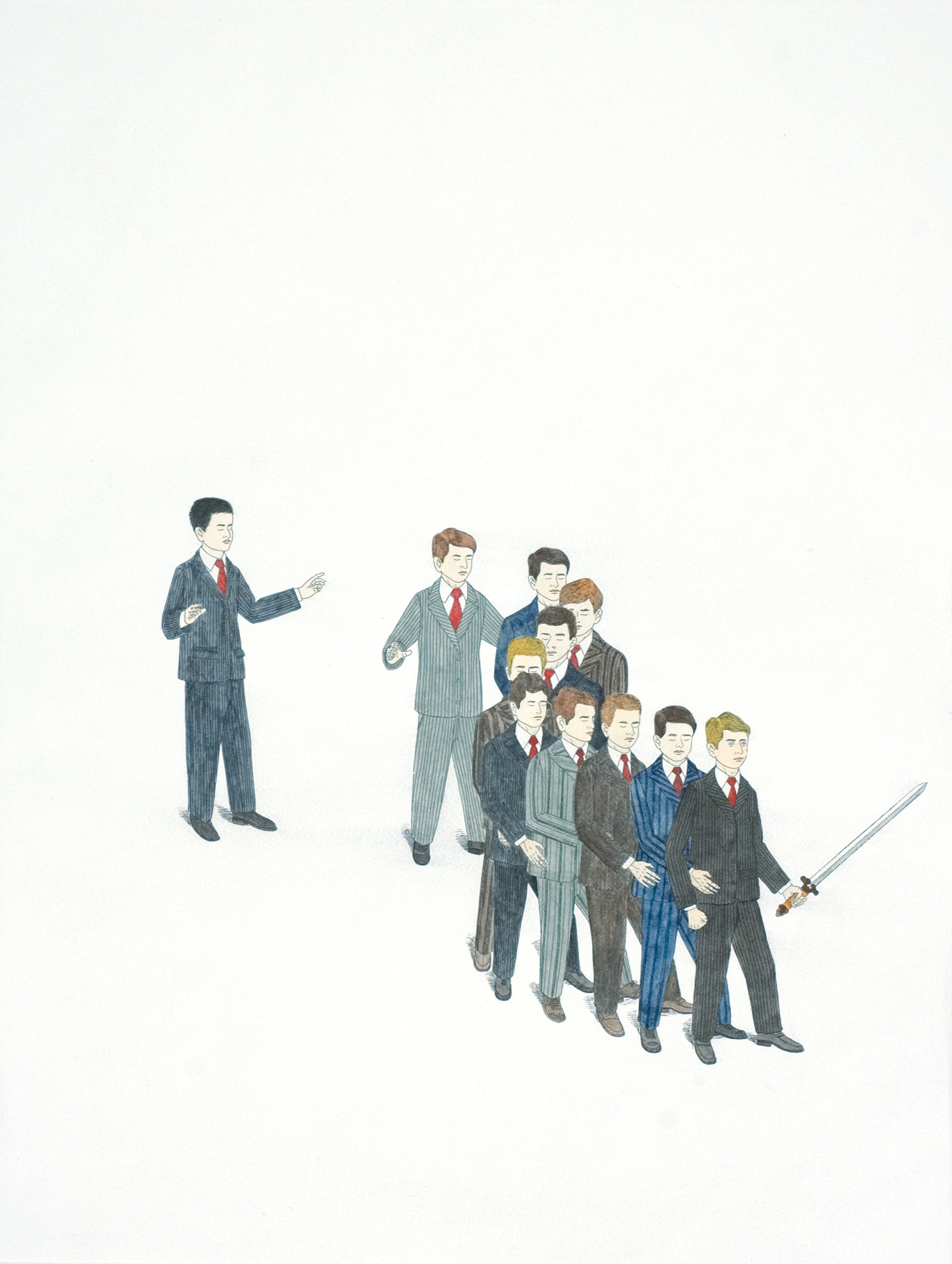 Unlike his clear, highly detailed drawing style, his narratives are obscure. At first glance, his figures seem to evolve from children’s book illustrations; on closer inspection, they reveal a strangely sinister side. Containing references to Asian iconography, American pop culture and Catholicism, del Rosario’s narratives emerge from an exploration of identity and culture. Born and raised in St. Louis, Missouri, to parents of Filipino descent, he is attuned to the power struggles within families possessing multiple cultural alliances. Del Rosario envisions his narratives as a complex game in which the figures represent members of opposing cultural teams. They compete for power, often with no clear winner, and the end result is usually an assimilation of cultural images.