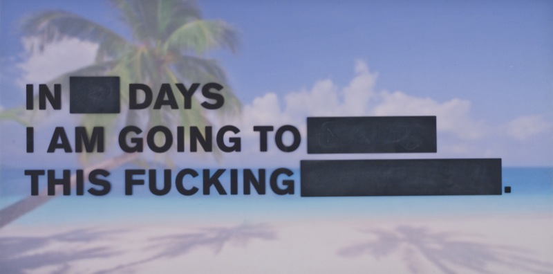 Steve Lambert, “In Days I Am Going To ,” 2010, archival inkjet, screenprint, and chalkboard paint on paper and plexiglass, 24″ x 48.25″ x .25″ overall, edition of 3. Not available.