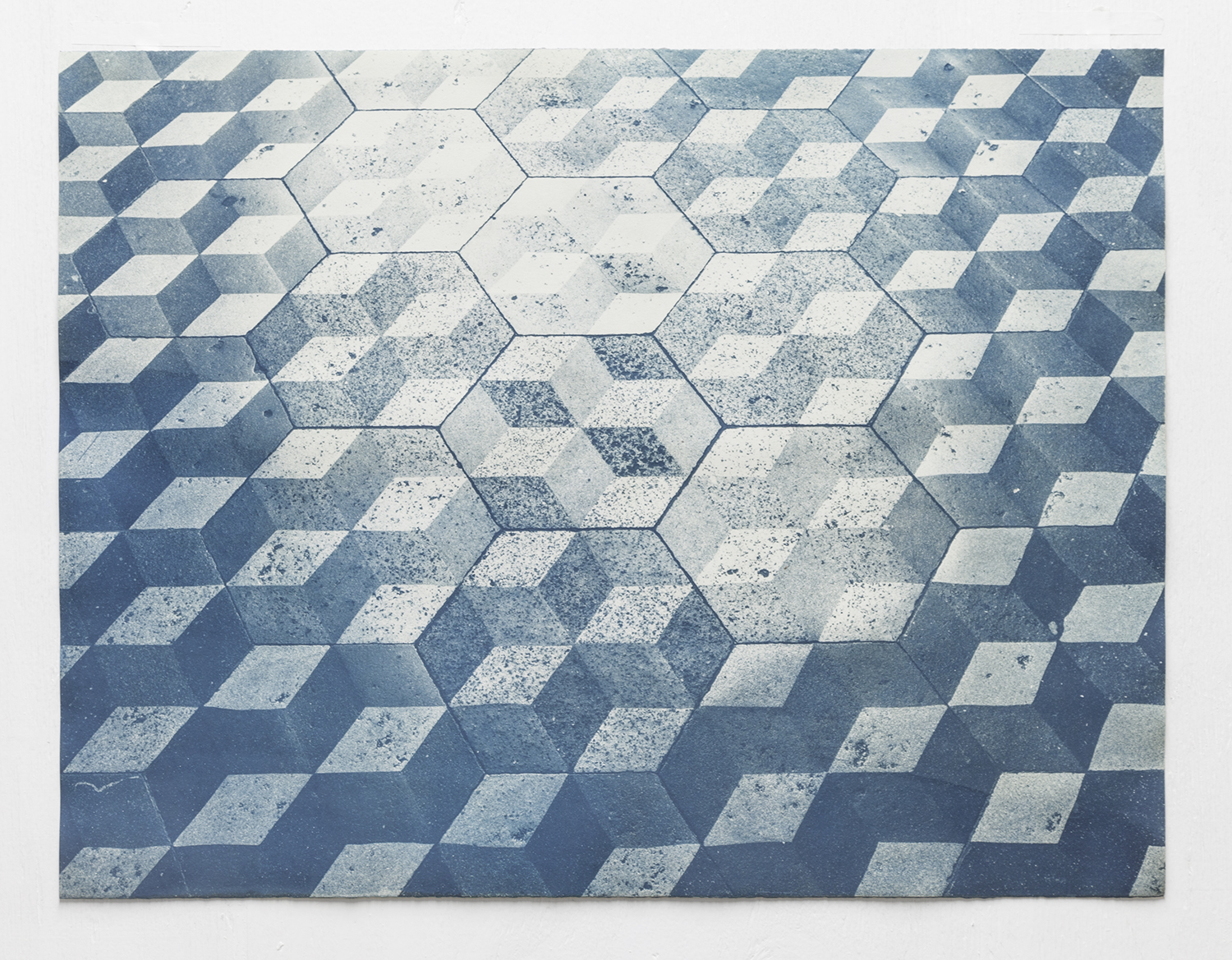 Asuka Goto reveals a deep engagement with inherited objects in photo album 07-01 and photo album 01-5 , where she screen prints and collages over images pulled from her father’s lone childhood photo album. The anonymous adolescents pictured in the album are revealed and obscured with ink and paper, allowing the viewer to follow the eye and mind of the artist as a young girl searching the faces of these unknown children. In Telmo 1-4 , Claudia Cortinez trains her eye to the intricate tile flooring in Telmo Argentina, allowing for the geometry and marbling of the tiles to render the floor monumental. The sporadic reflective puddles disallow these images from being read as complete abstractions; her cyanotype prints are toned with coffee, wine, and matte, testing the indexical trace of the colors and smells of her homeland.