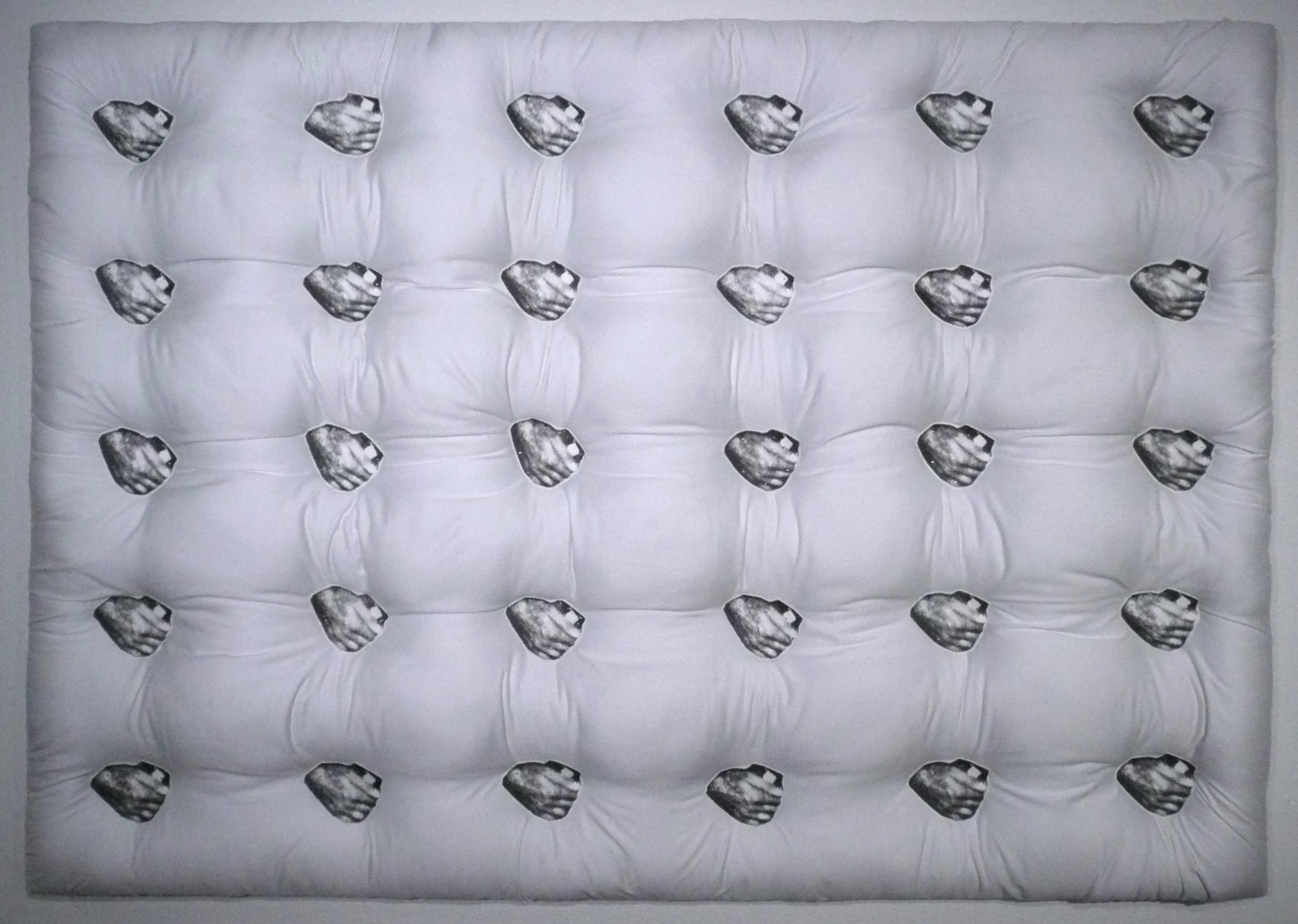 The prints in this exhibition stem from a common sense of disconnection. Some of the works display a literal sense of division, as is the case in Golnar Adili’s Work Pillow (2013) and Patience (2013).