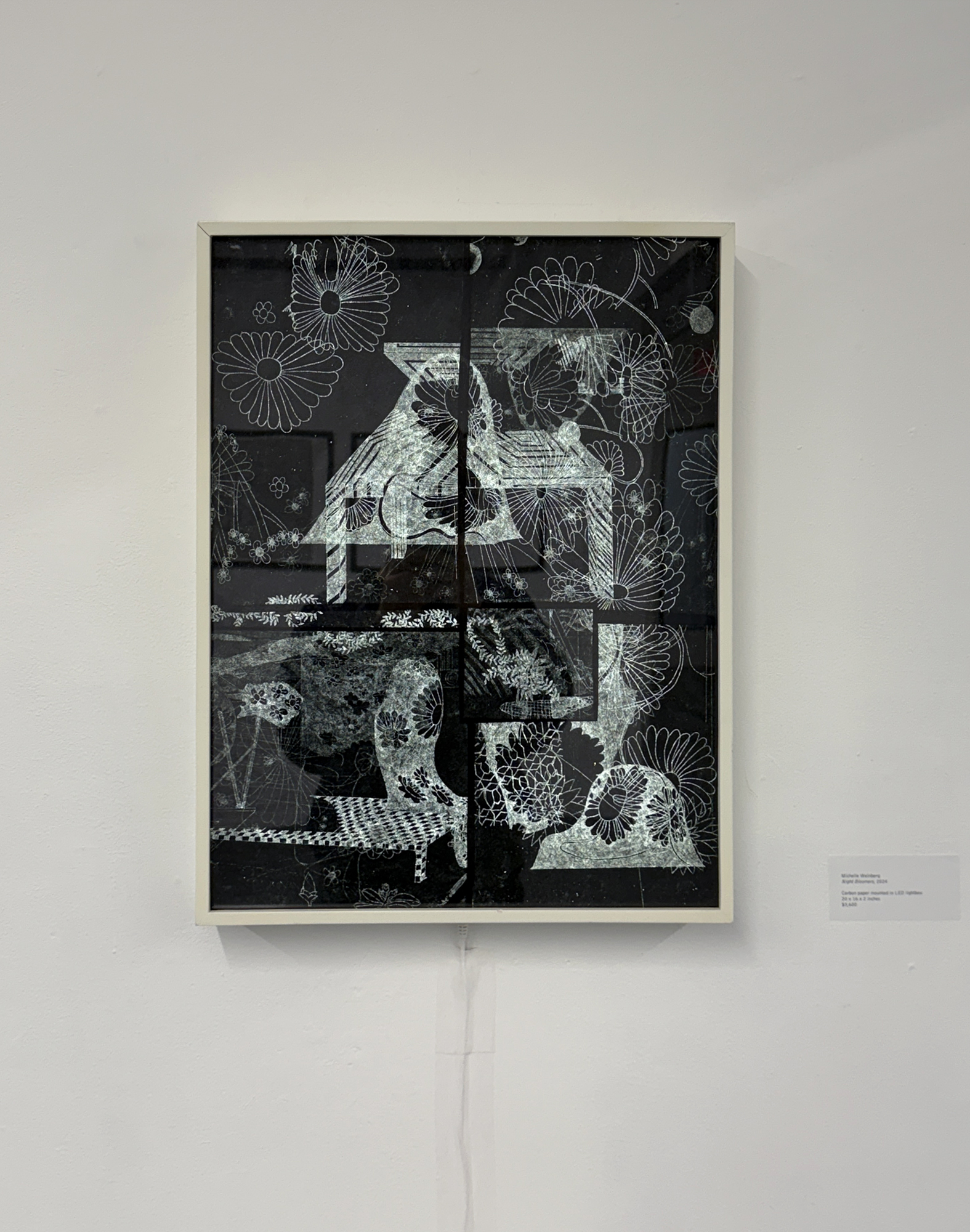 Helen Quinn’s Ribbon (2025) depicts a ribbon in gray-to-black shades that floats and unfolds with deliberate control, as if time and space were contained and expanded within a single gesture. Michelle Weinberg’s Night Bloomers (2024) is a light box where layered marks form skeletal architectures, tracing time and recurring motifs while creating an intimate, imagined space shaped by memory and perception.