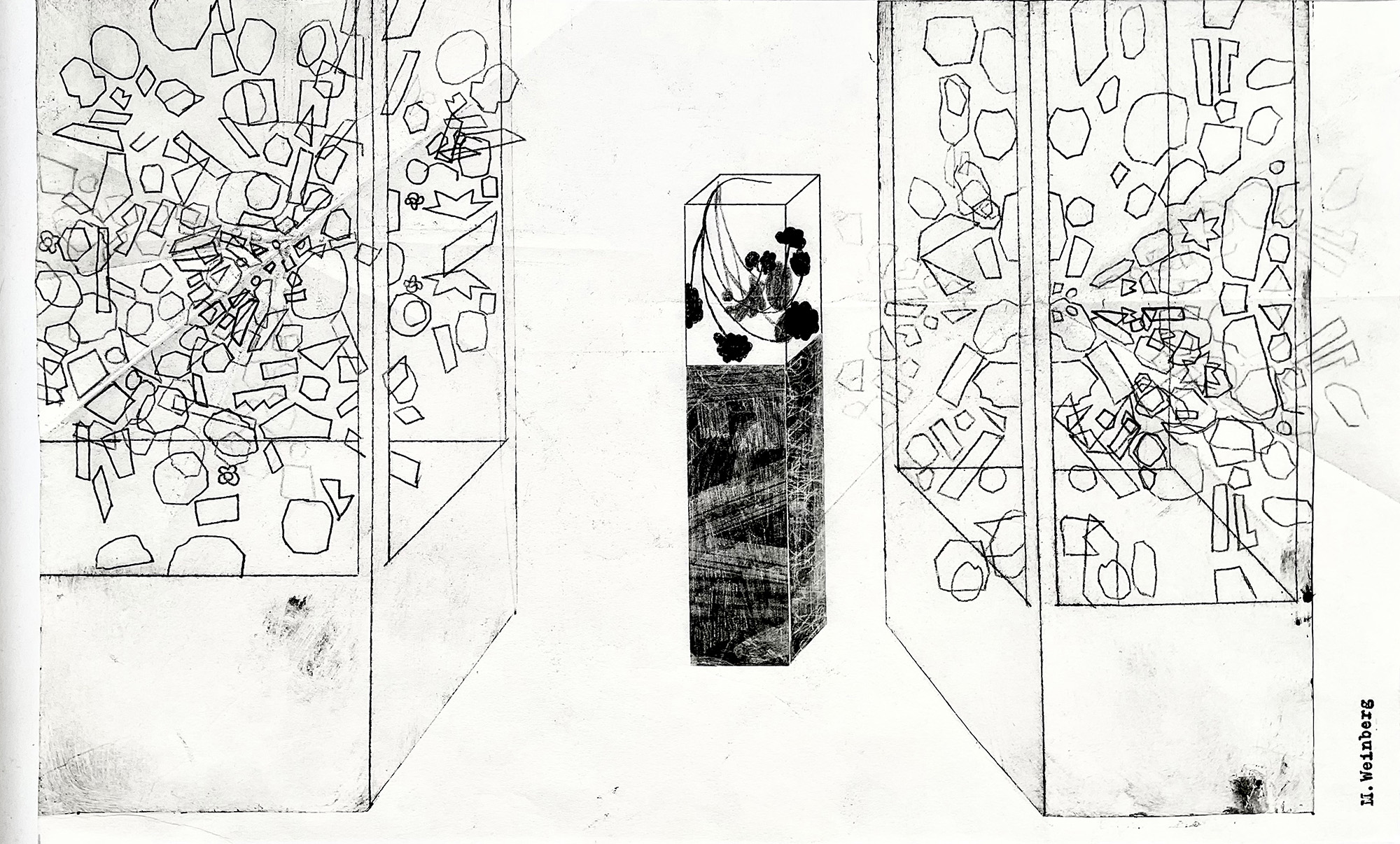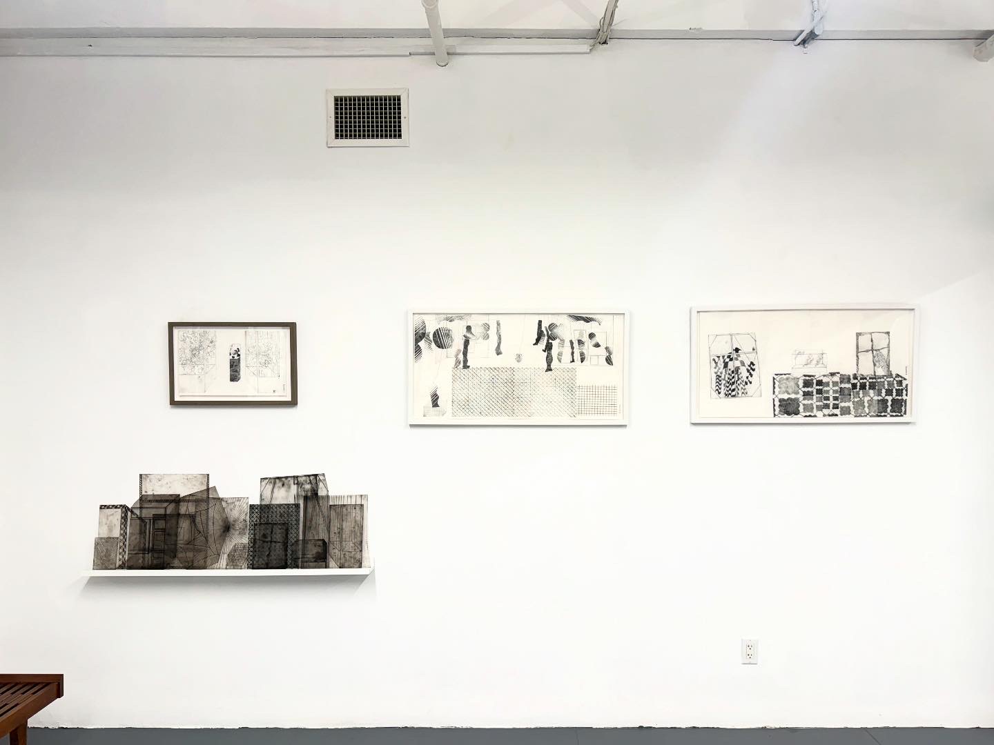 Similarly, Michelle Weinberg employs what she describes as various “engines of drawing” to explore the tensions between the handmade and mechanical and digital reproduction. Her drypoint etchings and carbon transfer drawings generate ghostly, imprinted traces and, through this spectral repetition, animate familiar forms. In her work, motifs reappear, much like actors returning to the stage. The use of repeated images suggests a visual language in flux, where each iteration carries the memory of previous marks, accumulating meaning over time.