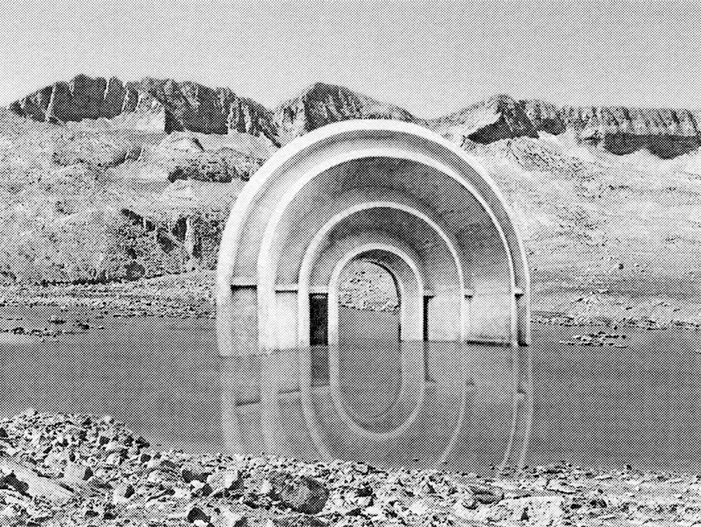 Lower East Side Printshop is pleased to present Three days in the desert guest curated by Sadia Shirazi. The exhibition will be on view at the Printshop from September 26 – November 25, 2018 with a public reception on Wednesday, September 26, 6 – 8pm. A modernist ruin sinks into a stream in Michelle Gevint’s digital composite print Untitled (Urban Speculation) . Its curved form is mirrored by its reflection, creating a dystopic portal. Her aluminum prints appropriate photographs of urban sprawl to meditate on the aerial view, a technology of vision used by colonial states, urban planners and the military alike. Umber Majeed’s Hypersurface of the