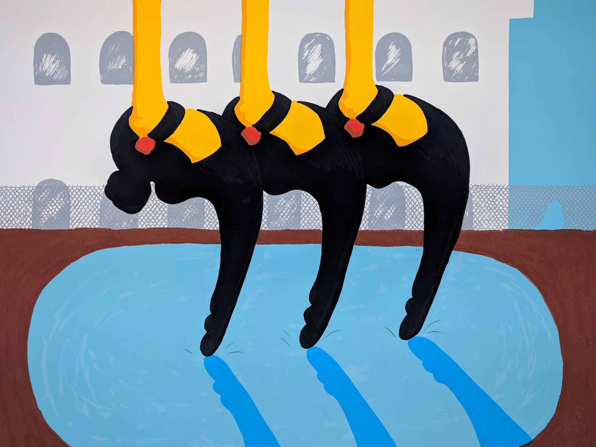 Bundith Phunsombatlert’s relief print, Welcome, introduces his physical impressions of a memory, recalling the architecture and floorplan of the railroad-style apartments inhabited by his family. Well known to many immigrant New Yorkers, the solid lines and ethereal spaces seem bereft of their previous life. Jesse Chun’s Mann er of Speaking merges Korean, English, and numerals into a silkscreened series of five works embodying the recombinant and ambiguous nature of language and communication. Hannah Smith Allen’s triptych reproduces the border wall between the U.S. and Mexico from varying positions, adding location markers and texting icons to call forth the communication—and silence—between two nations with a shared history and unstable future. Nina Feigin’s series of monoprints utilize bright colors, collaging, and appropriation to needle the oddness and emptiness of American commercial advertising and visual culture. And Crys Yin’s ribald colors bring uncanny dreamscapes into a jarring conversation with reality. In works dealing with New York City’s overwhelming visual experience, Yesuk Seo reproduces the common sight of a bike chained to a fence on a transparent surface, and Felix Plaza assembles and contrasts signs, street corners, and architecture in an approximation of the dizzying experience of city life. A second print by Plaza, Silencio , features an empty throne on translucent material, conjuring memories and histories though ghostly and faded.