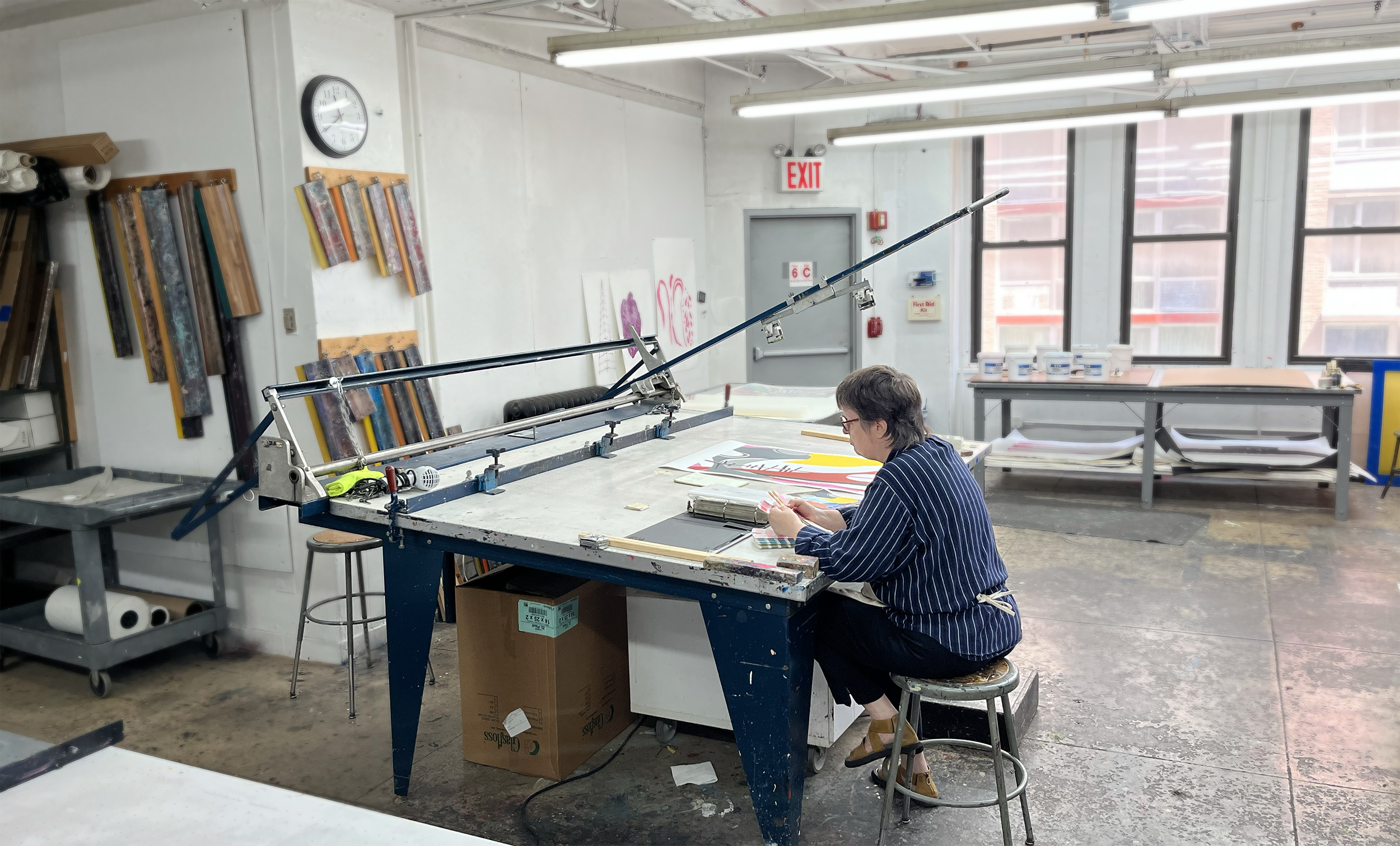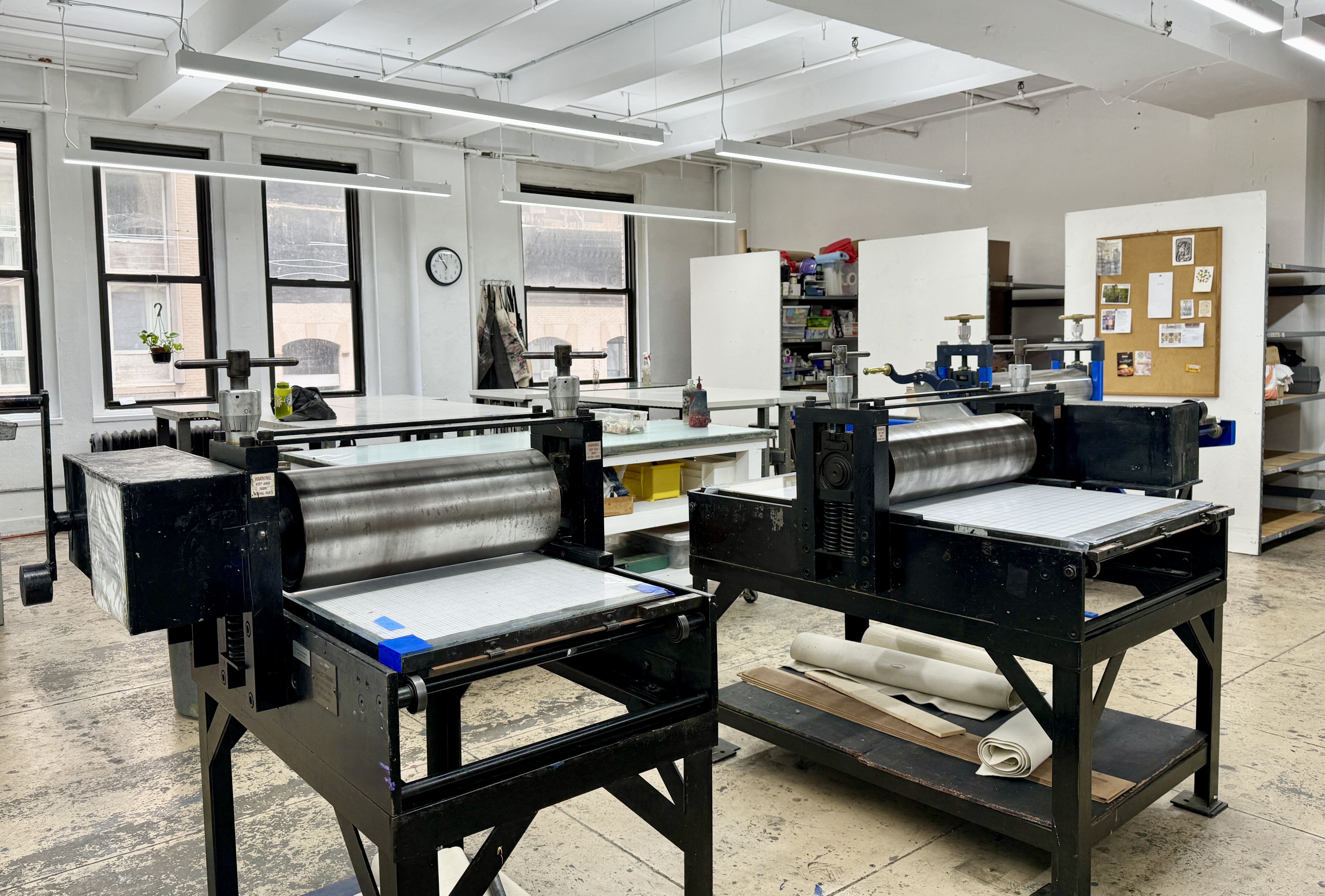 The Lower East Side Printshop offers 4,000 sq. ft. of printmaking workspace in two studios and two workrooms. The facility is located on the 6th Floor of an industrial building facing West 37th Street in New York City. Both studios are filled with northern light. They have concrete floors and 11 ft. ceilings. Passenger elevators are available 24/7, and freight elevators are available during regular business hours M-F, 8am-5pm.
