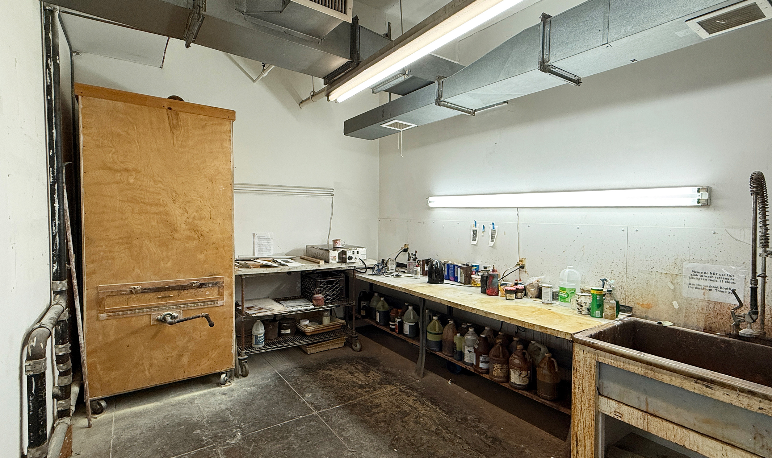 The solvent/etching room is accessible 24/7 to artists working in the community studio. It has adjustable exhaust ventilation. Only ferric chloride solution is used for etching.