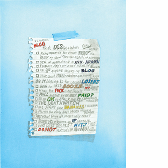 William Powhida was born in 1976 in New York and received his MFA from Hunter College and BFA from Syracuse University. This print was created in response to a heated panel discussion about art blogging in January 2010 that included the artist; Paddy Johnson, author of the highly respected blog Art Fag City; and gallerist Edward Winkleman. In the text, Powhida shares his thoughts about blogging, continuing his ongoing satirical investigation of power and personality in the art world. Powhida was the recipient of the Printshop's 2010 Publishing Residency. Exhibitions include Platform Gallery, Seattle, WA; Winkleman Gallery, New York, NY; Postmasters, New York, NY; Schroeder Romero & Shredder, New York, NY; and Schirn Kunstalle Frankfurt, Frankfurt, Germany. Powhida is represented by the Postmasters Gallery, New York, NY; Charlie James Gallery, Los Angeles, CA and Platform Gallery, Seattle, WA.