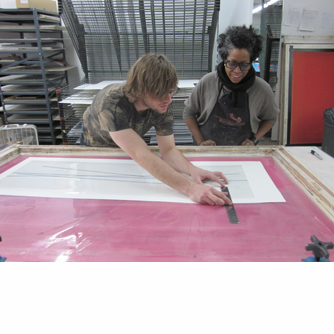 Pictured: Artist Jennie C. Jones working with Master Printer Erik Hougen, 2012.